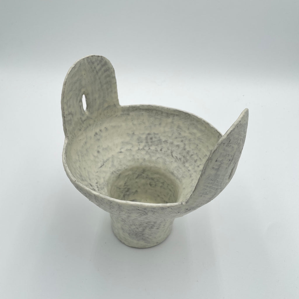 Ce récipient de forme circulaire possède deux hautes et fines anses ajourées. Il est jonché sur un haut et large pied circulaire. L'artiste a utilisé la technique sud-coréenne du buncheong.